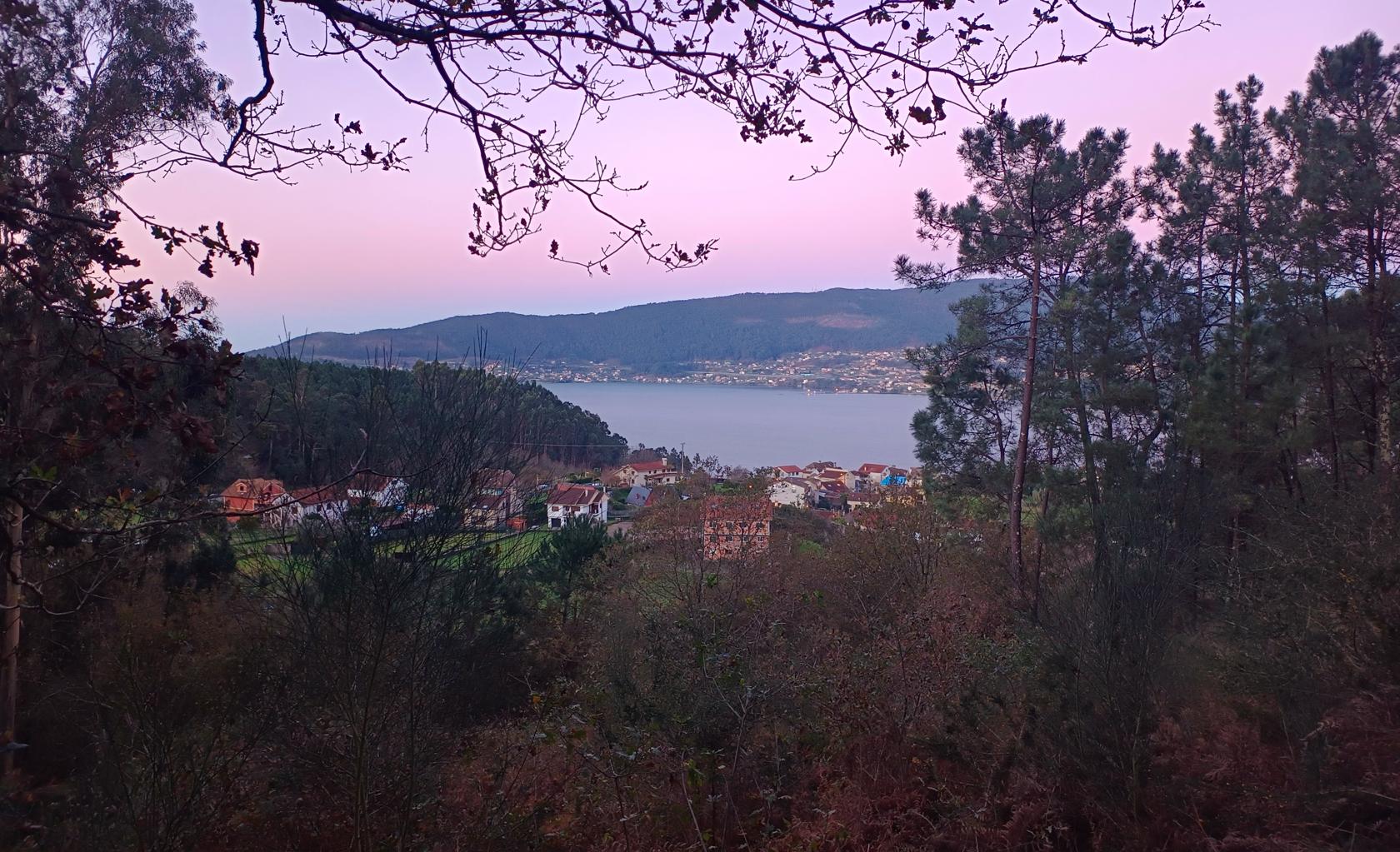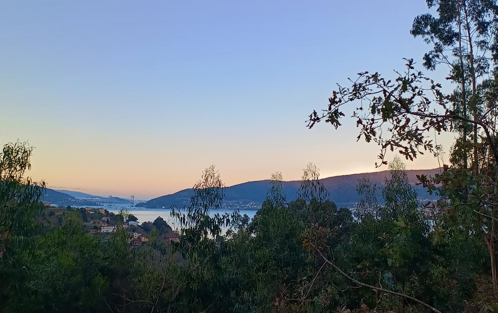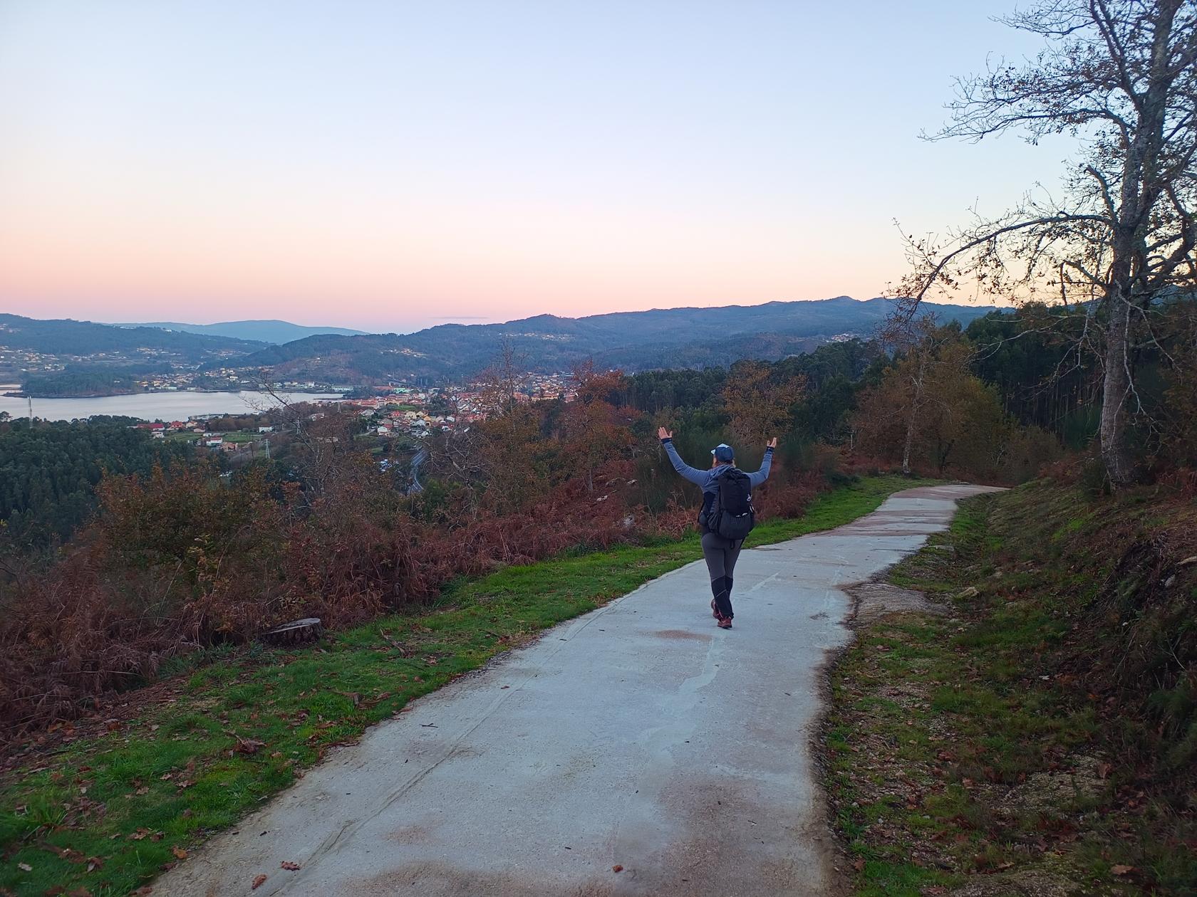 Šlapeme dál. Mají tu moc hezký most a v dáli vidíme Vigo – vypadá to moc nádherně. Svítí slunce a fouká ledový vítr, ale neprší!