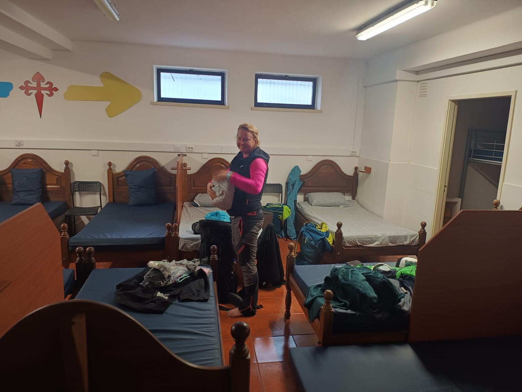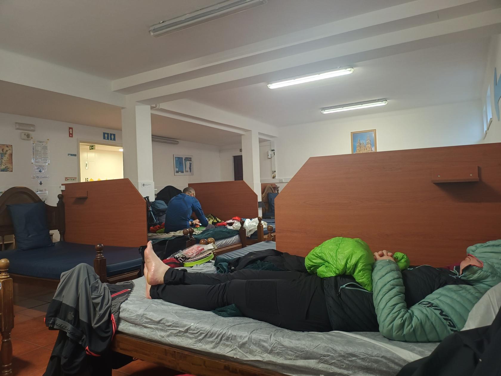 Vtipný albergue. Postele oddělené přepážkami – soukromí sice žádné, ale člověk má aspoň lepší pocit, že mu spolunocležník v noci nevrazí loket do ksichtu. Usínám vyčerpáním.